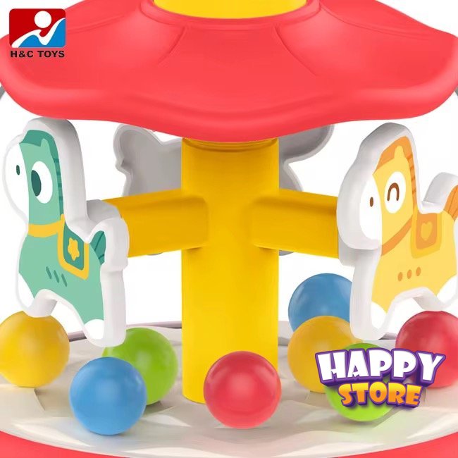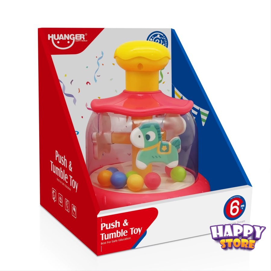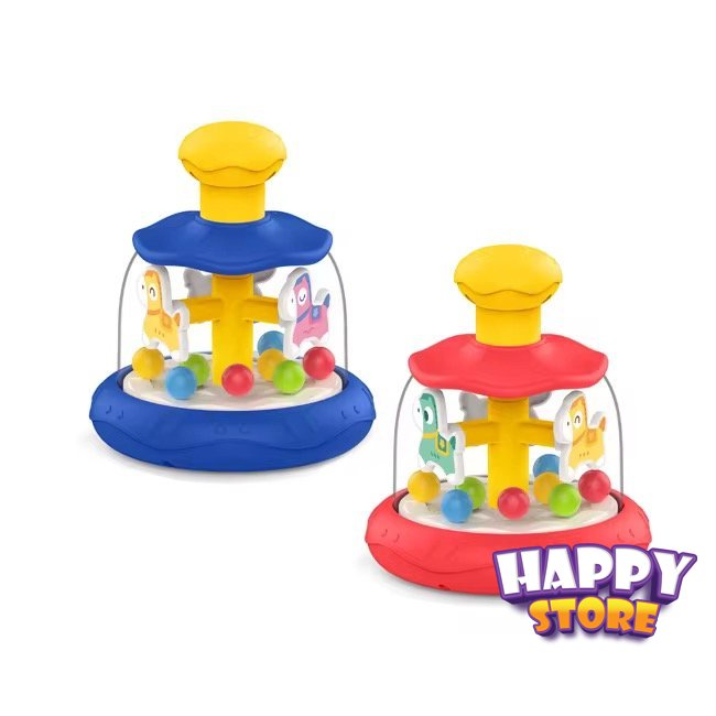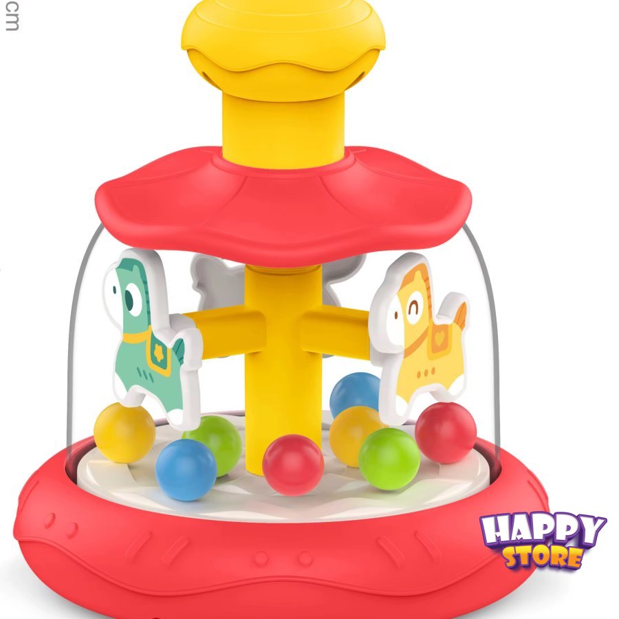 تعتمد على فكرة الضغط من الأعلى ليبدأ الجزء الداخلي بالدوران وتحريك الكرات الملونة داخل القبة الشفافة، مما يجذب انتباه الطفل ويحفّزه على التفاعل.