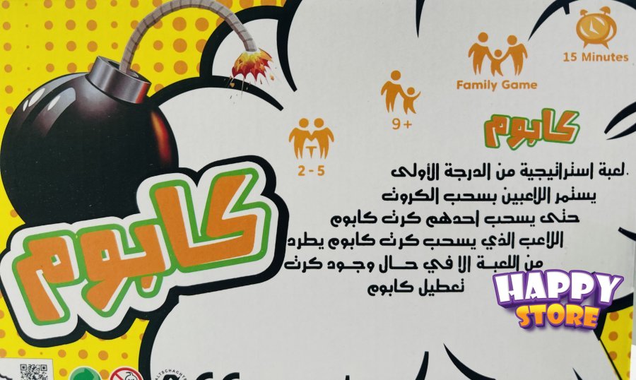 كابوم (Kaboom) هي لعبة بطاقات تفاعلية ممتعة تعتمد على السرعة والحظ، مناسبة لجميع الأعمار (2-5 لاعبين). الهدف هو جمع أكبر عدد من الكروت من خلال الإجابة على أسئلة أو تنفيذ مهام معينة، بينما يجب تجنب سحب كروت "كابوم" (Kaboom) التي تؤدي إلى خسارة جميع الكروت المجمعة.