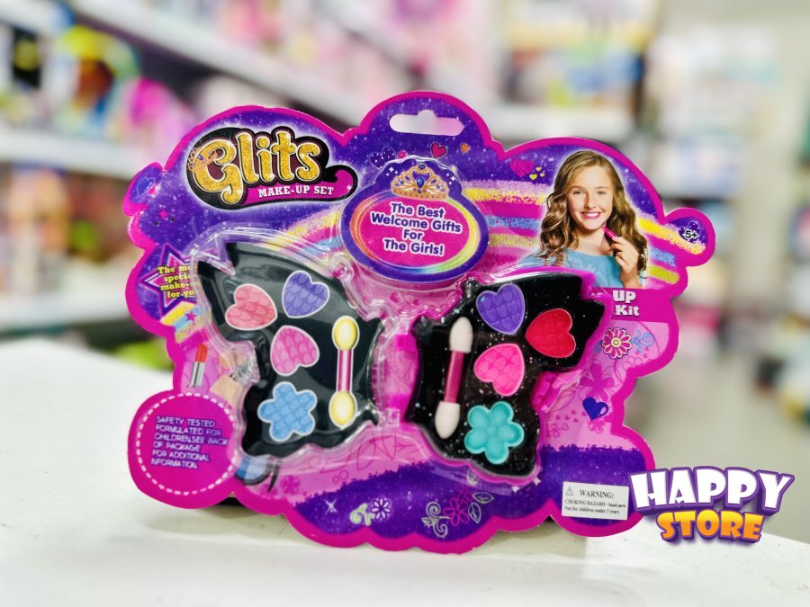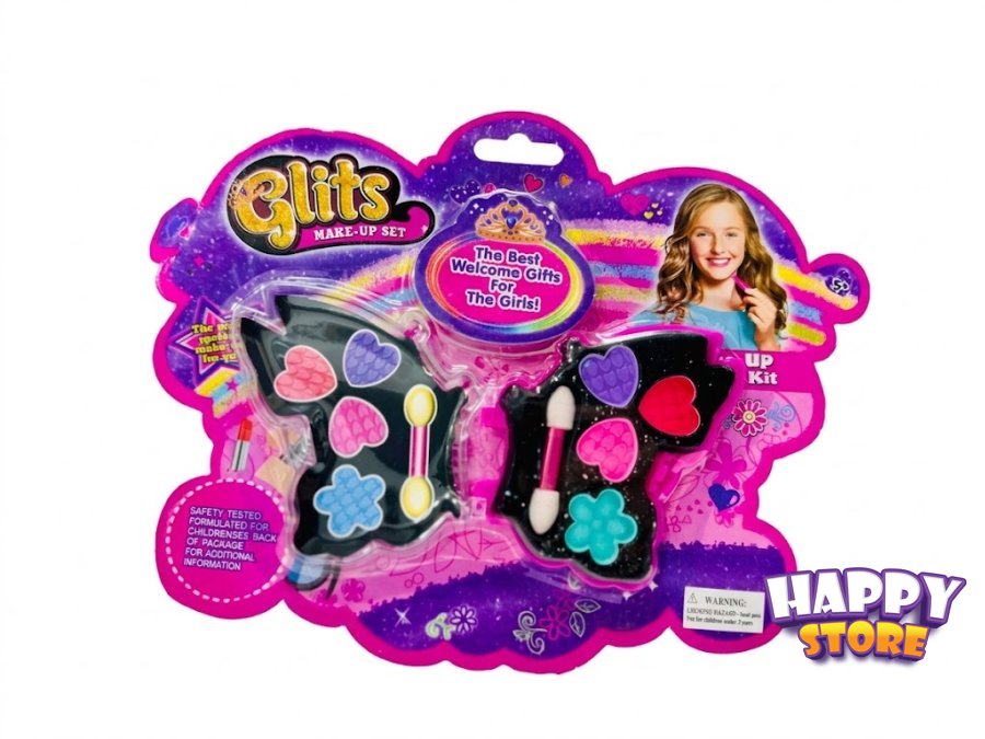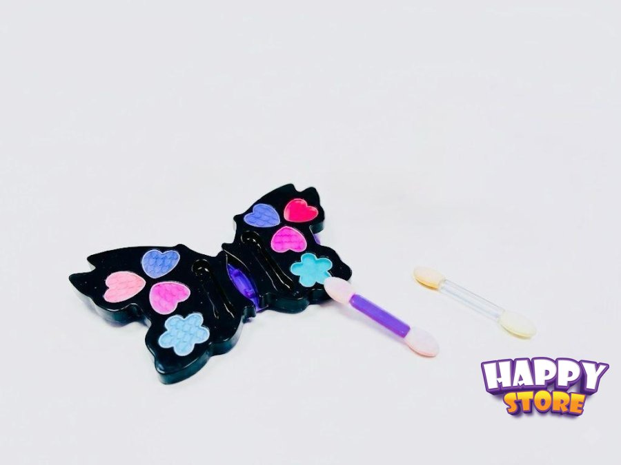 مجموعة مكياج داخل علبة بلاستيكية مصممة على شكل فراشة سوداء أنيقة تحتوي على ألوان متنوعة ومبهجة.