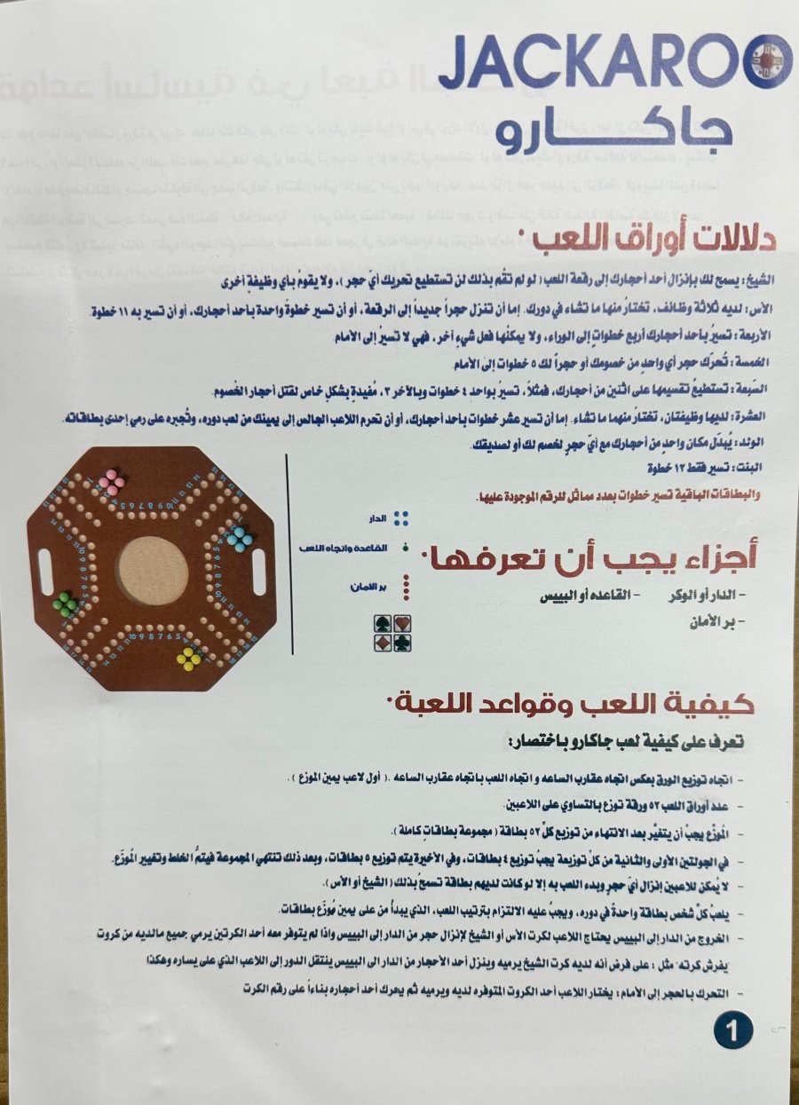 لعبة جاكارو (Jackaroo) هي لعبة لوحية استراتيجية شهيرة جداً، تعتمد بشكل أساسي على أوراق اللعب (الكوتشينة) لتحريك القطع، بدلاً من استخدام النرد.