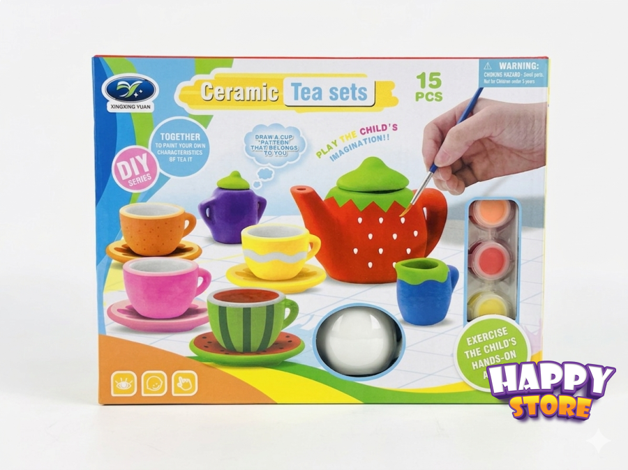 • مكونات كاملة (15 قطعة): يحتوي الطقم على قطع سيراميك متنوعة (إبريق، فناجين، أطباق صغيرة)، بالإضافة إلى مجموعة ألوان مخصصة وفرشاة تلوين.