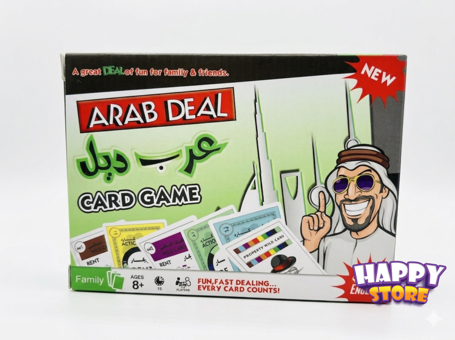 لعبة عرب ديل (Arab Deal) هي لعبة بطاقات حماسية وسريعة، مستوحاة من فكرة "مونوبولي ديل". تعتمد اللعبة على التخطيط والسرعة في جمع الممتلكات والسيطرة عليها للفوز بالمنافسة.