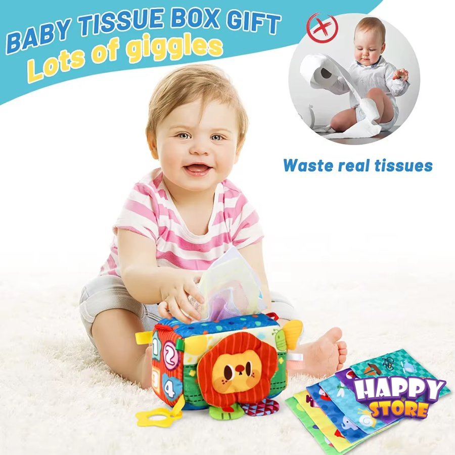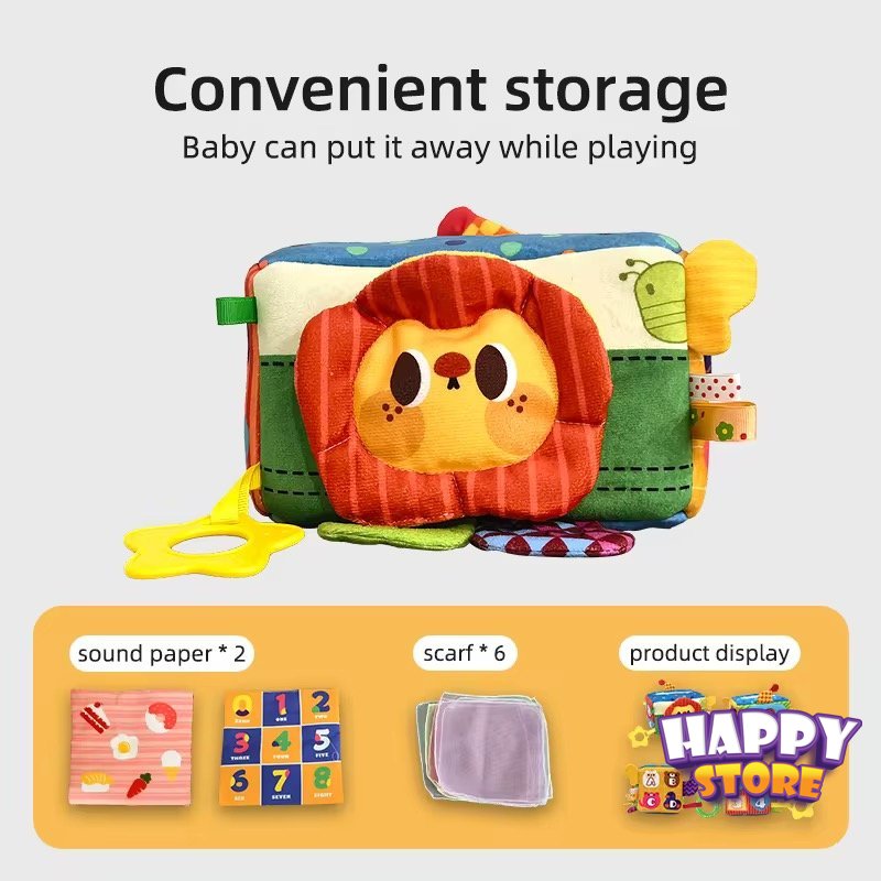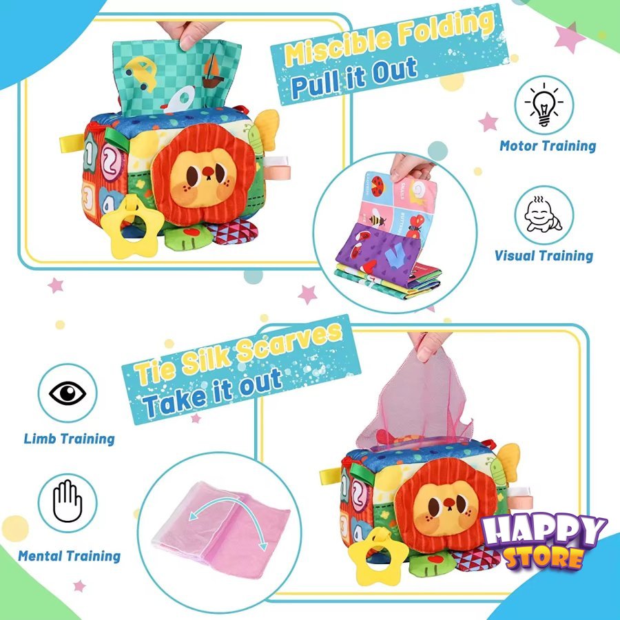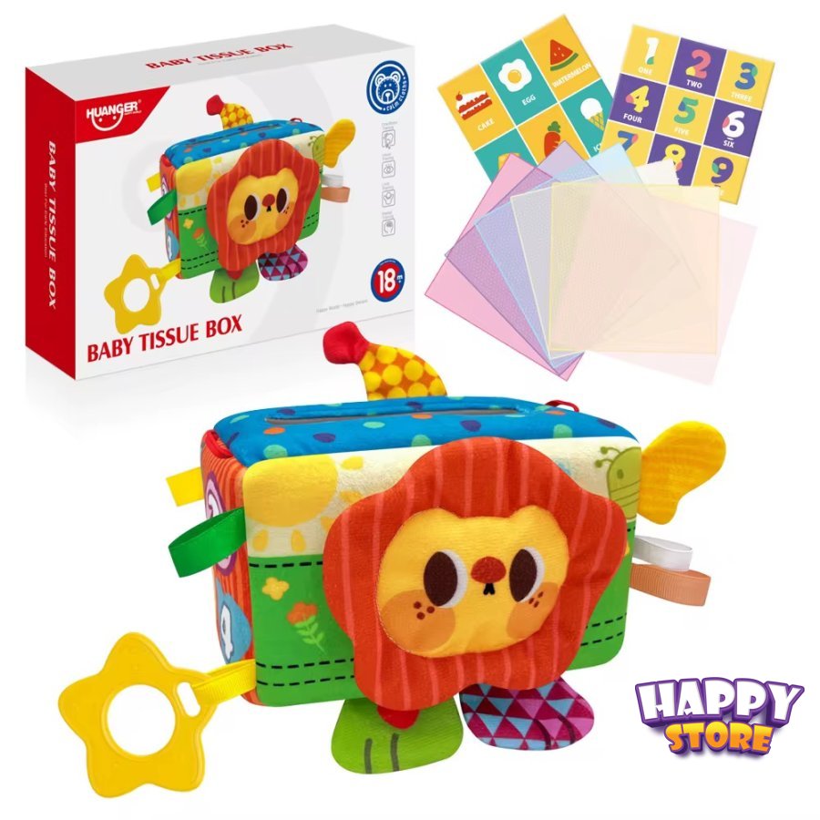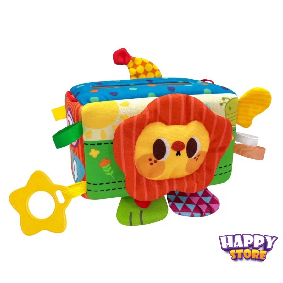 هي لعبة قماشية على شكل أسد، بتيجي معها “محارم قماش” يقدر الطفل يسحبها ويعيدها.
