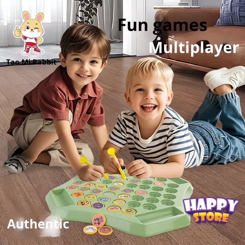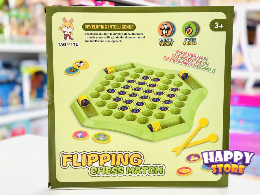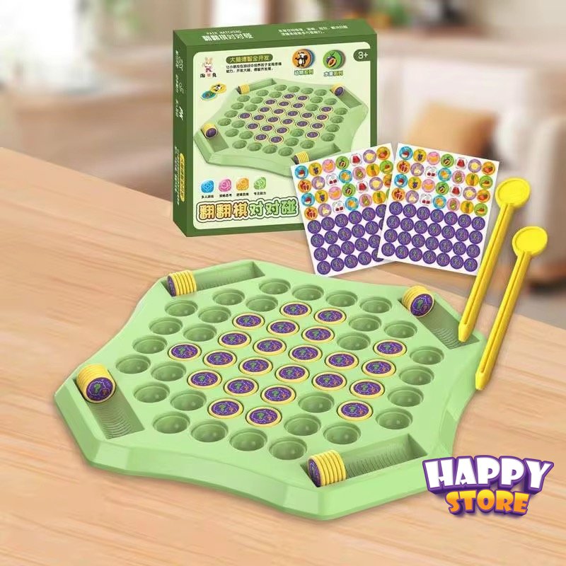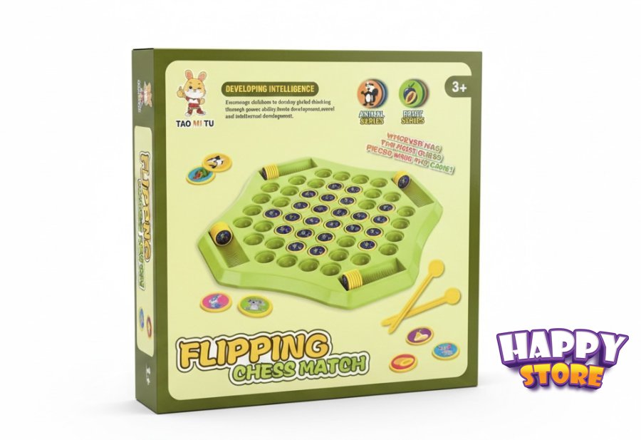 •المكونات: تتضمن لوحة اللعبة، عدة قطع بنقوش حيوانات/فواكه، واثنين من “عصي الأصابع” لقلب القطع
